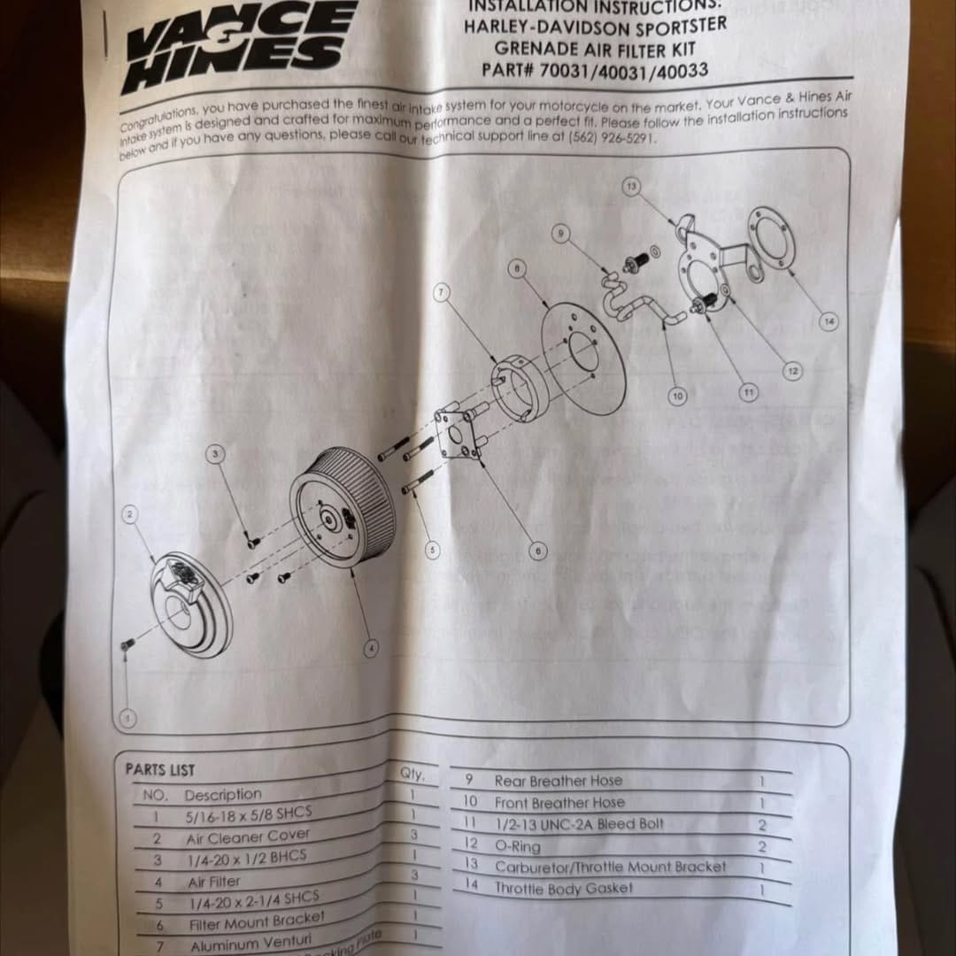 HARLEY-DAVIDSON SPORTSTER\nGRENADE AIR FILTER KIT\nPART# 70031\/40031\/40033\nVANCE & HINES quantity